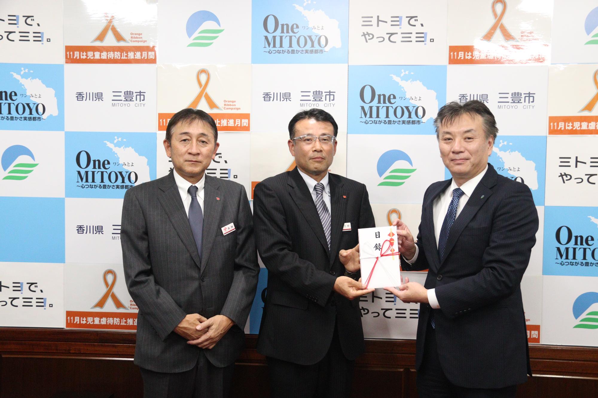 贈呈式では、四国電力株式会社観音寺営業所の三好寿志所長が市長に目録を贈呈し、「当社が地域共生活動や社会貢献活動に取り組む中で、地域の防犯に貢献したいという気持ちがあり、今回の寄贈に至った。市民の皆さんのため、役立てていただけたらと思う」と話しました。