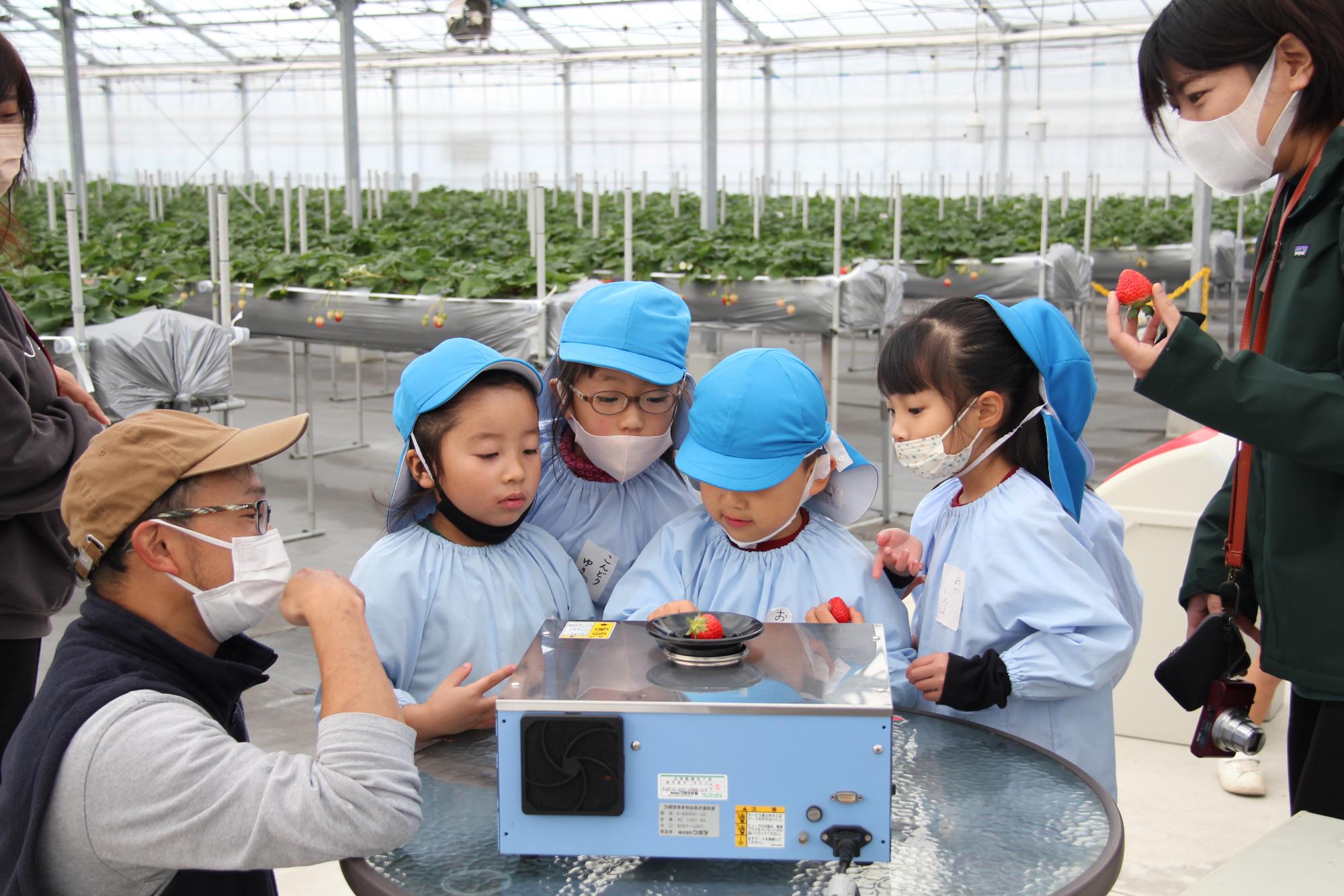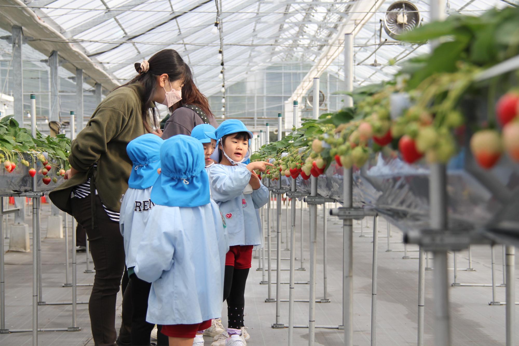 「がっこうのイチゴ園財田上」では、地域貢献の一環として子どもたちがイチゴ狩りに招待されました。子どもたちは、「すごく甘いけど、ちょっと酸っぱさもある」とか「もう給食が食べられない」と言いながら、大きくきれいに実った「さぬきひめ」を嬉しそうにお腹いっぱい味わっていました。スタッフからイチゴの種類や上手な摘み取り方などの話を聞いた後には、「何で白から赤になるの?」「みつばちはいる?」など、さまざまな疑問を質問していました。