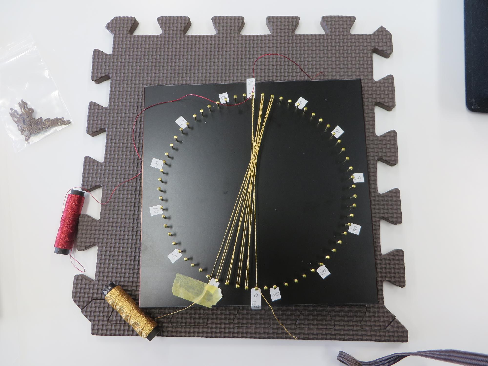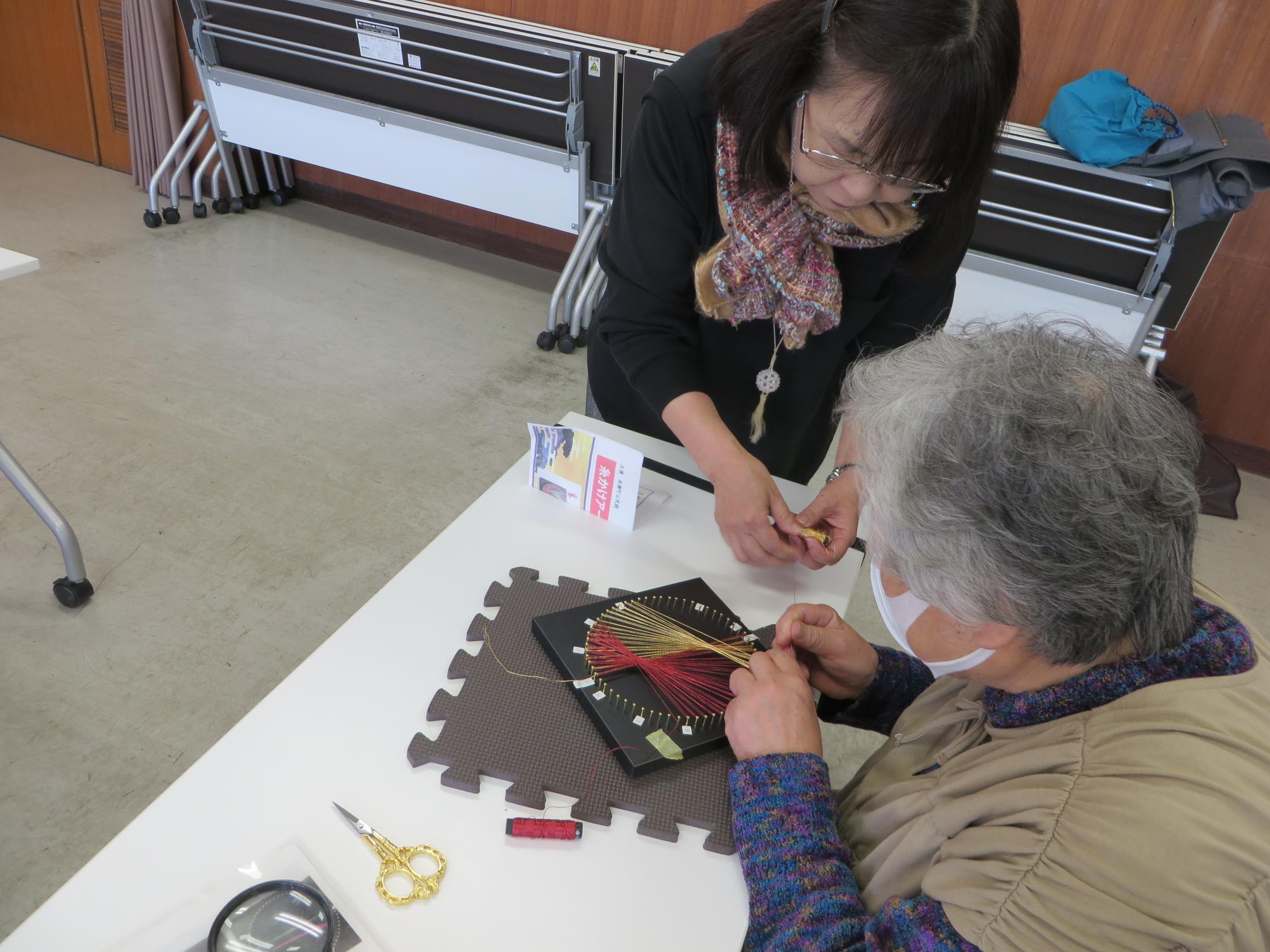 お正月の飾りらしく、金色と赤色の2色の糸を使い、金、赤、金、赤と交互にピンに糸をかけていきます。細い糸と小さなピンに糸を引っかける簡単な作業に見えますが、意外と難しく参加者からは「途中でどこに糸をかけたのか分からんようになるな。」と言う声が聞こえてきました。先生からは「間違えても大丈夫ですよ。最後でどうにかなりますから、進めていきましょう。」と励ましてもらい、全員、素敵なお正月飾りを作ることができました。