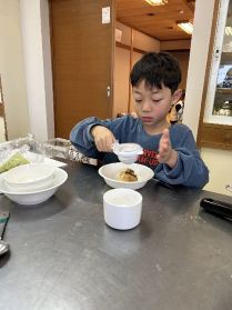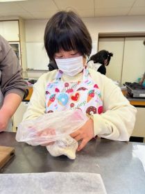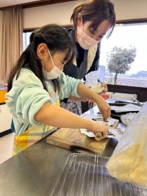 この日は、焼きあがったスコーンに粉糖を振り、1つだけ試食をしました。試食している間、講師から保護者へ家庭で子どもと一緒にお菓子作りをする時のワンポイントアドバイスも教えてもらい、親子共々、有意義な時間を過ごせた休日となりました。