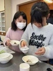 公民館にある調理道具は、どれも大人仕様の子どもたちの小さな手には大きいものばかりですが、参加した子どもたちはお母さんから正しい道具の使い方を教えてもらい、やわらかいバターや硬いチョコレートを頑張ってカットしました。この2つの硬さの違う材料を切った時の力加減などの手の感触も料理教室で体験する学びの1つです。