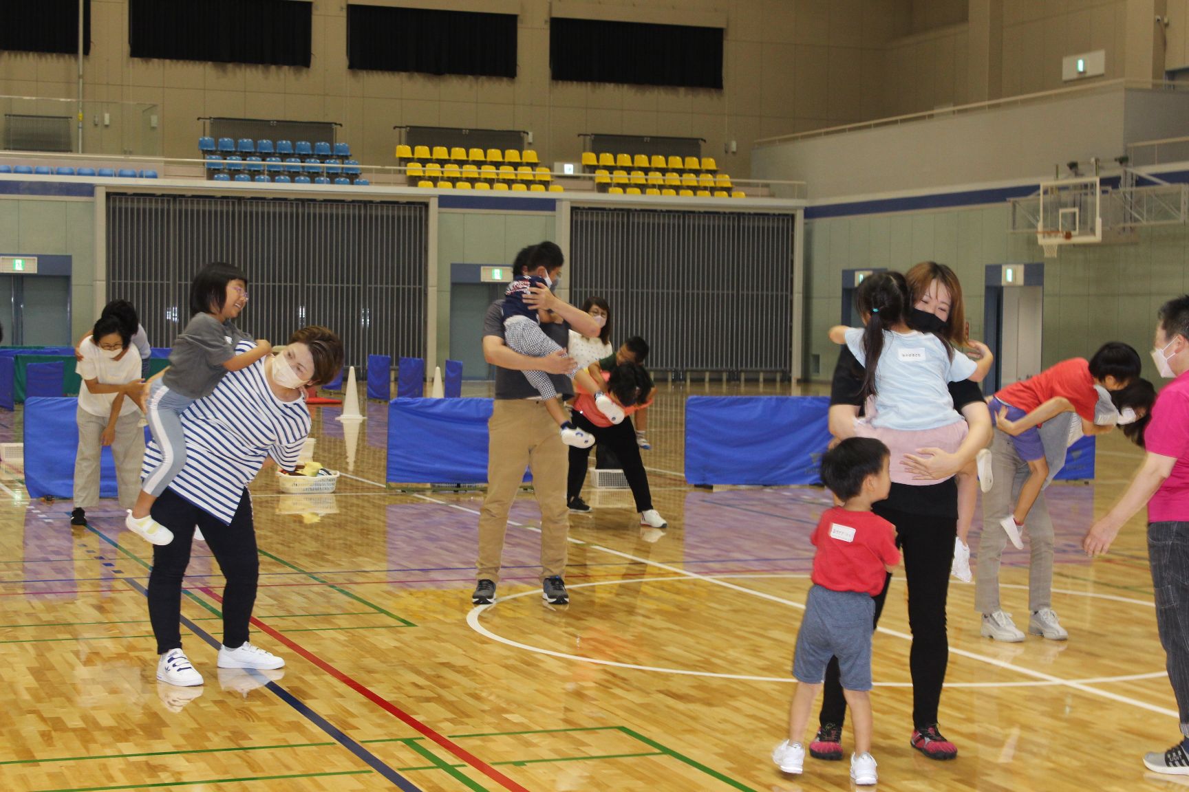 親子ペアになり、片手をつないだまま相手のおしりをポンとたたきます。その次は、お互いの膝をタッチしたほうが勝ち、という遊びも行いました。