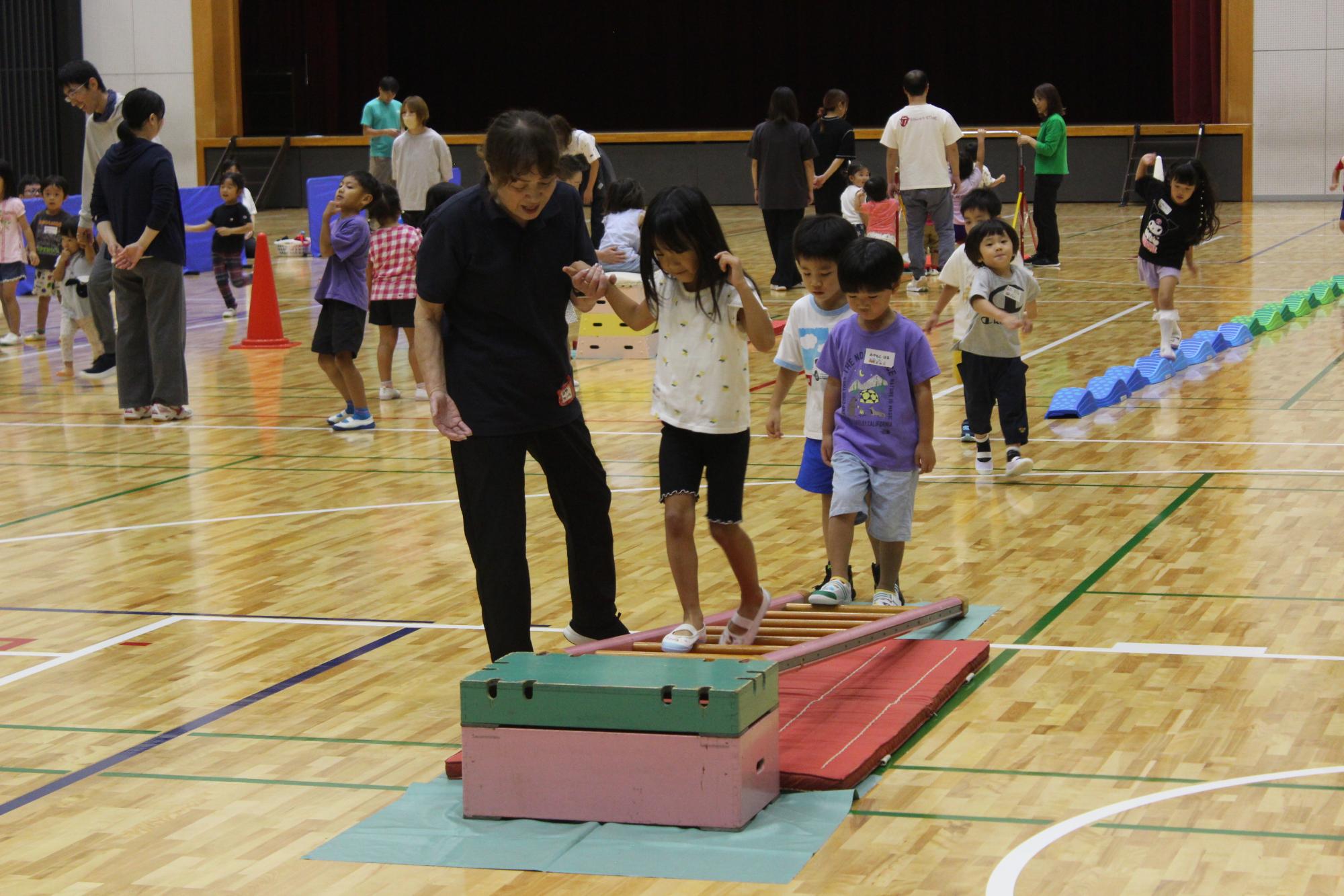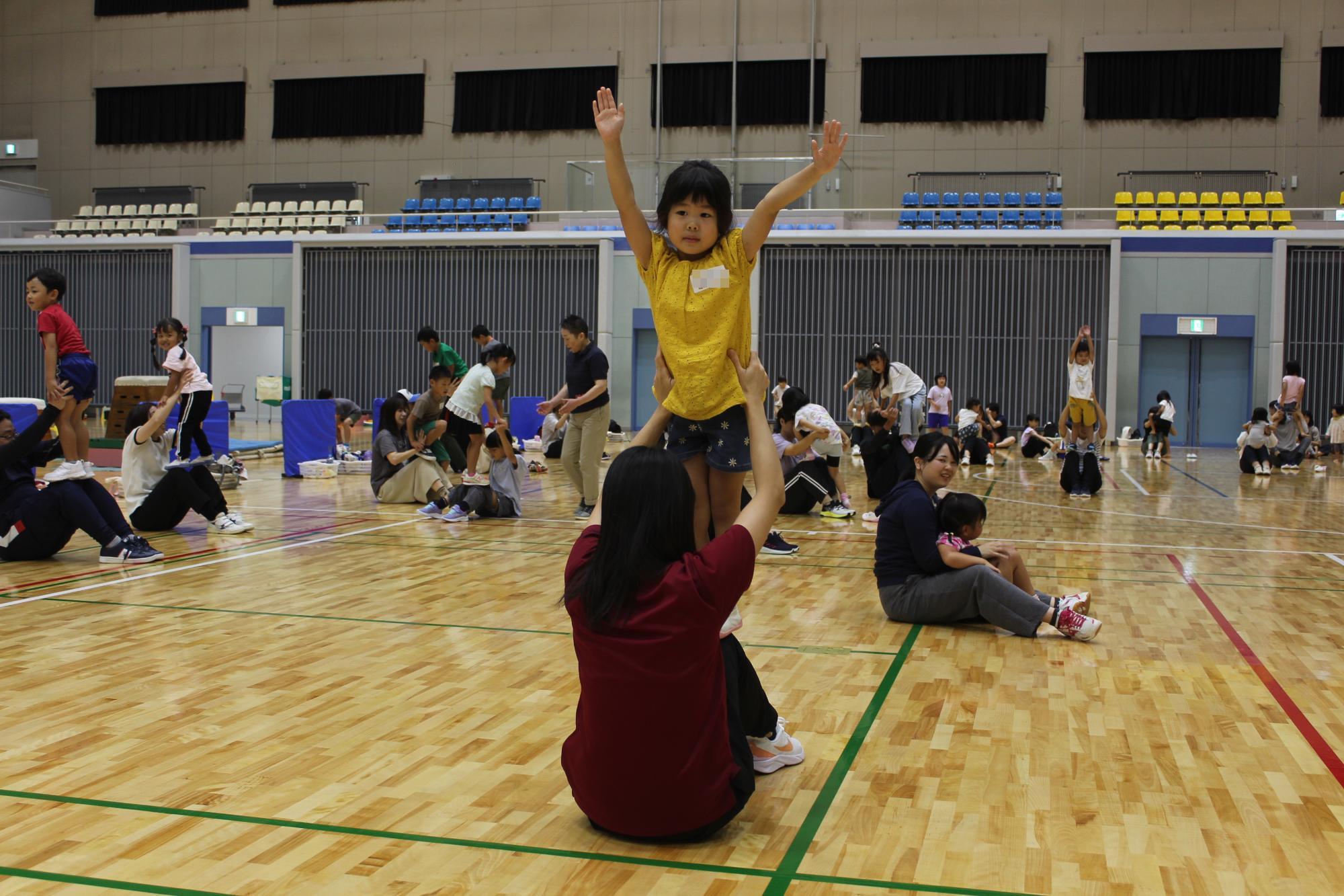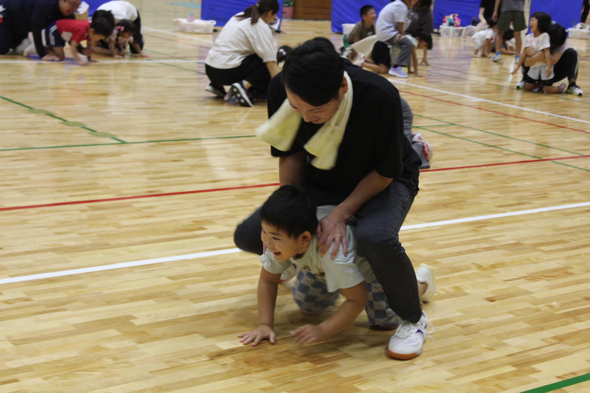 しっかりと手をつないで足の踏み合いや引っ張り合いをしたり、親子で役割を交代しながらの馬遊びなど、様々な運動遊びをしました。親子で笑い合いながら運動遊びを行う姿がとても微笑ましい光景でした。