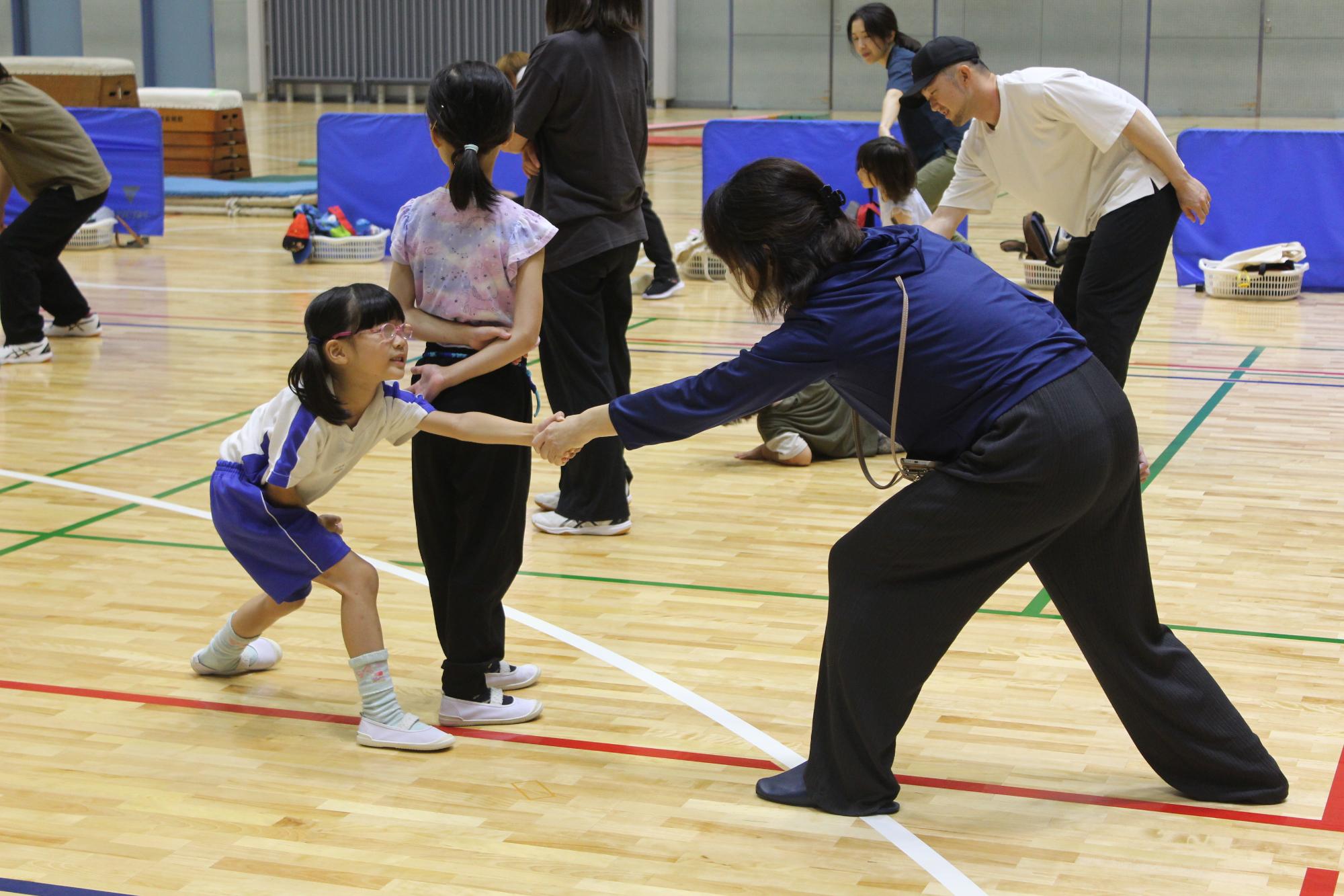 続いて、清水幸一氏による「親子運動遊び」を行いました。先生から「プレゴールデンエイジと呼ばれる5歳(早い子は2歳)から8歳頃は、神経回路の発達が急ピッチで進む大切な時期です。この時期に多種多様な動きを体験させ、体を動かす楽しさを知ることが、その後の専門的な技術の上達へつながっていきます。」と教わりました。
