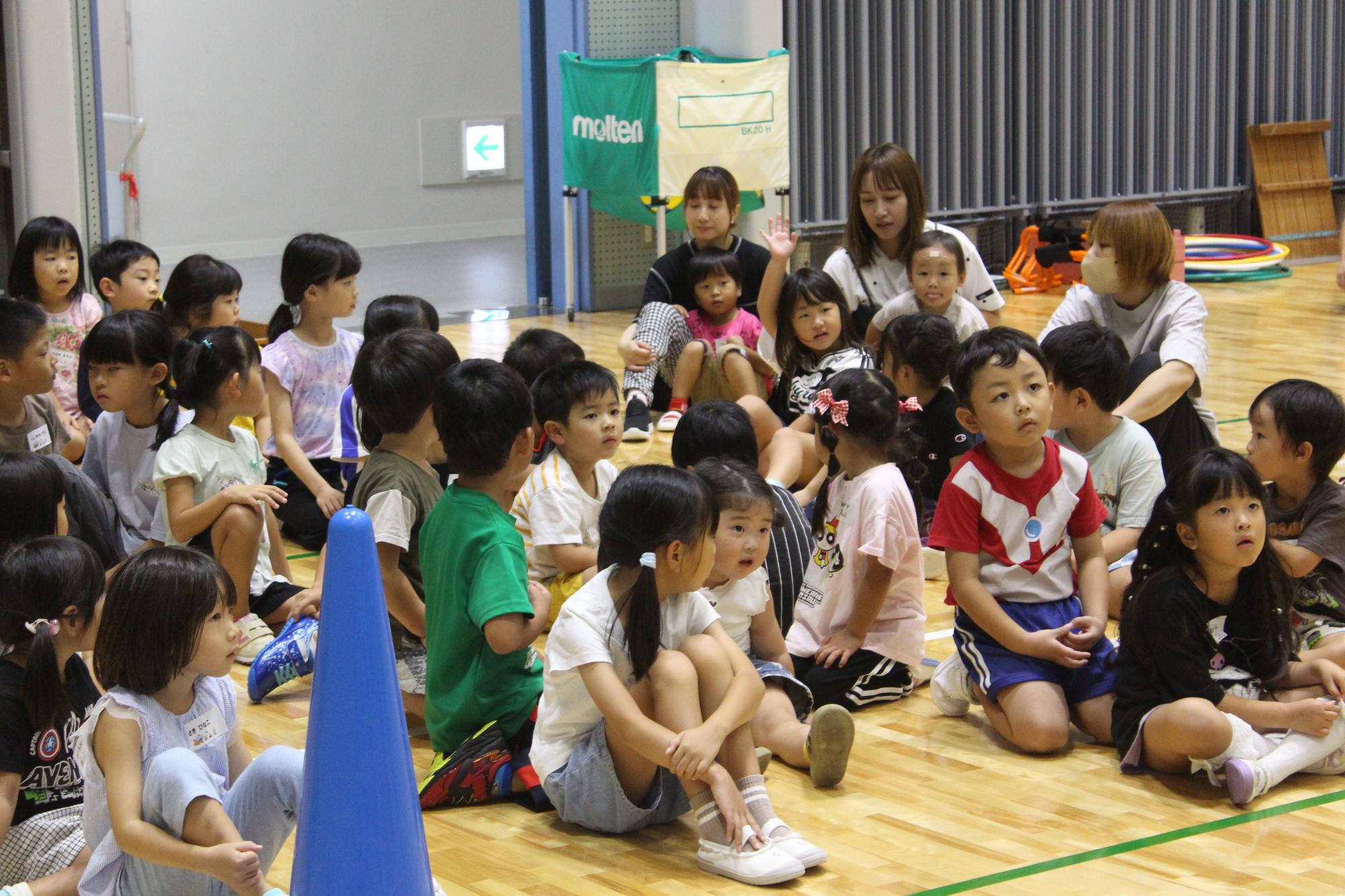 秋らしい過ごしやすい気候の中、三豊市総合体育館に37組の親子、総勢103名が集まり、ラジオ体操からスタートしました。