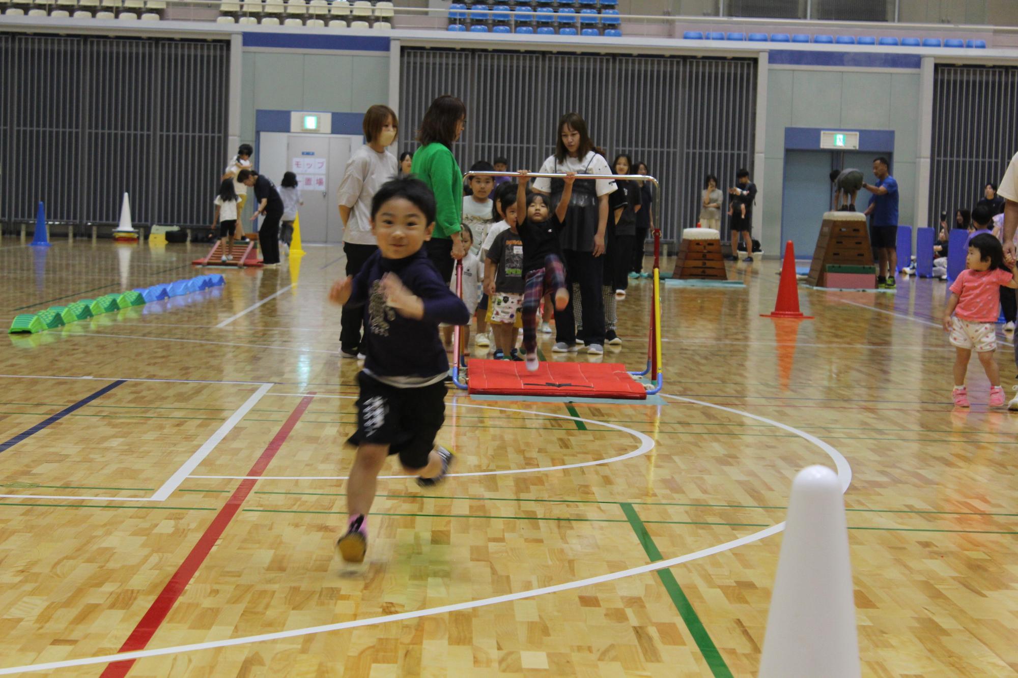 次は「サーキット遊び」です。出席を取る際、スタッフが子ども一人一人のお名前を読みあげると大きな声で「ハイ!」と言って手をあげることが出来ました。鉄棒、平均台、跳び箱、マット運動を元気よく周回し、遊んだ後は道具のお片付けをみんなで協力して行いました。