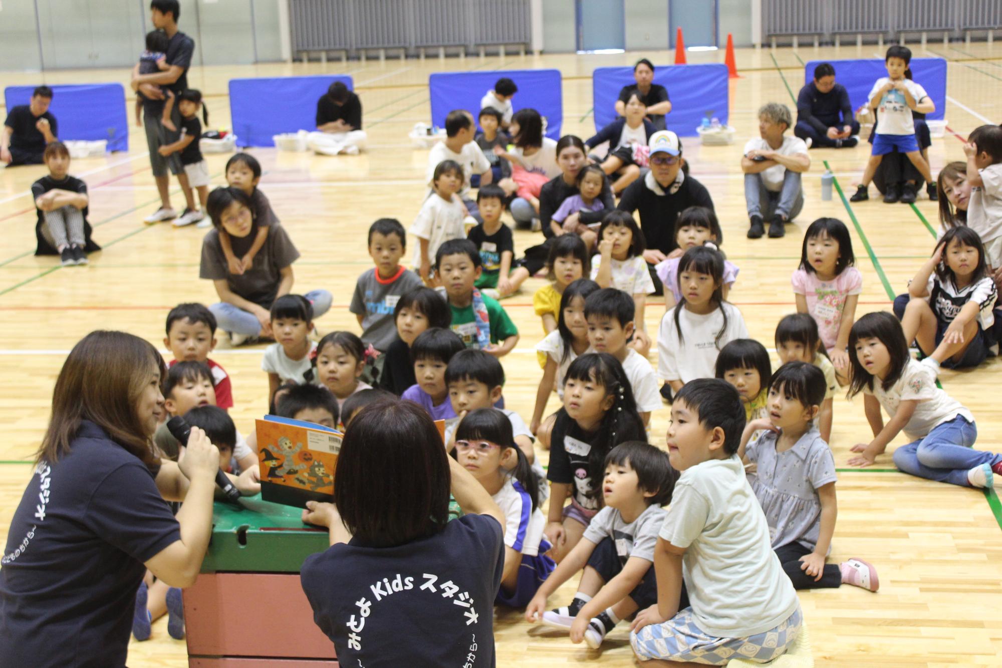 次に、絵本の読み聞かせの時間です。今回は「おばけのハロウィン」と「おかしとおうちくれませんか?」という作品でした。「トリック・オア・トリート」の言葉が頭に残りおばけが登場する楽しい話に、子どもたちは大喜びでした。