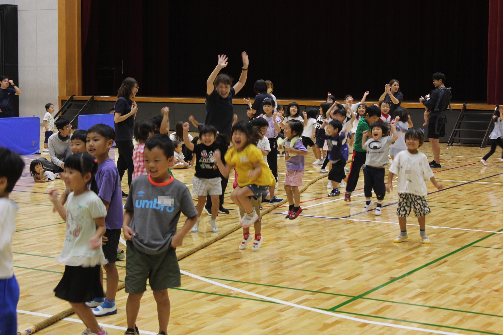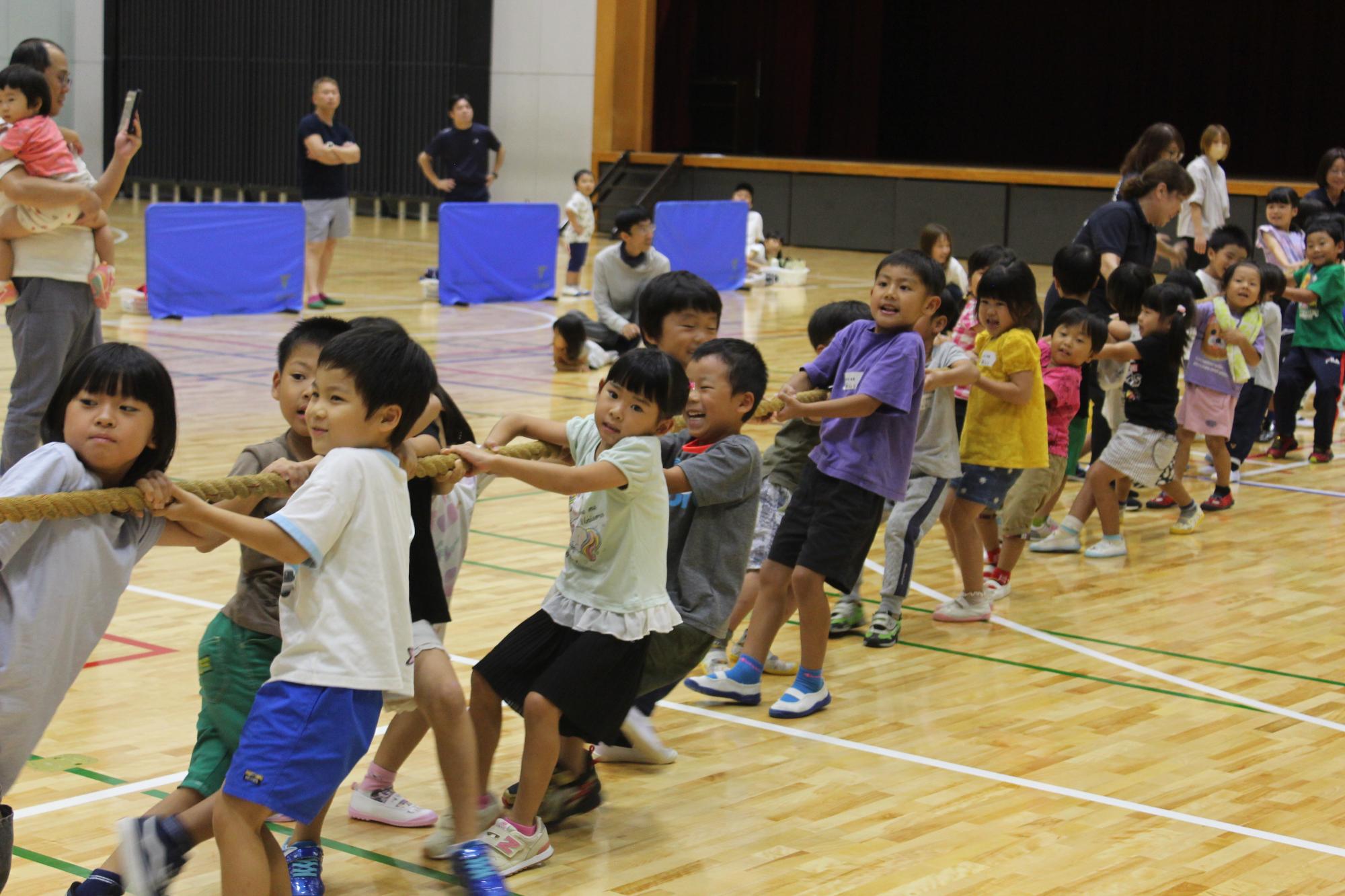 次に、「綱引き」を親チーム対子どもチームで行いました。一勝一敗で迎えた3回め、力が拮抗し白熱した戦いは子どもチームの勝利となりました。みんなで力を合わせて勝つことができ、子どもたちは飛び跳ねて喜んでいました。最後は、スタッフと元気よくハイタッチでお別れしました。