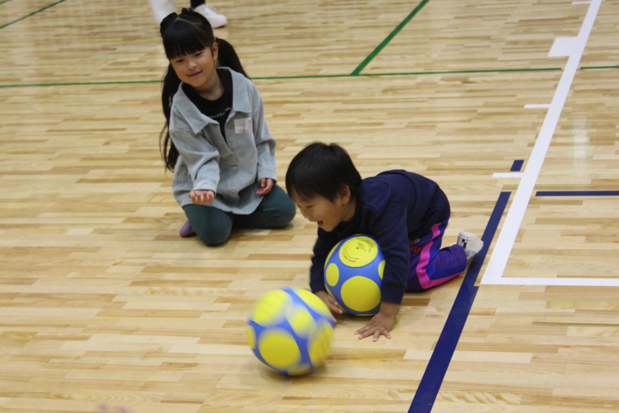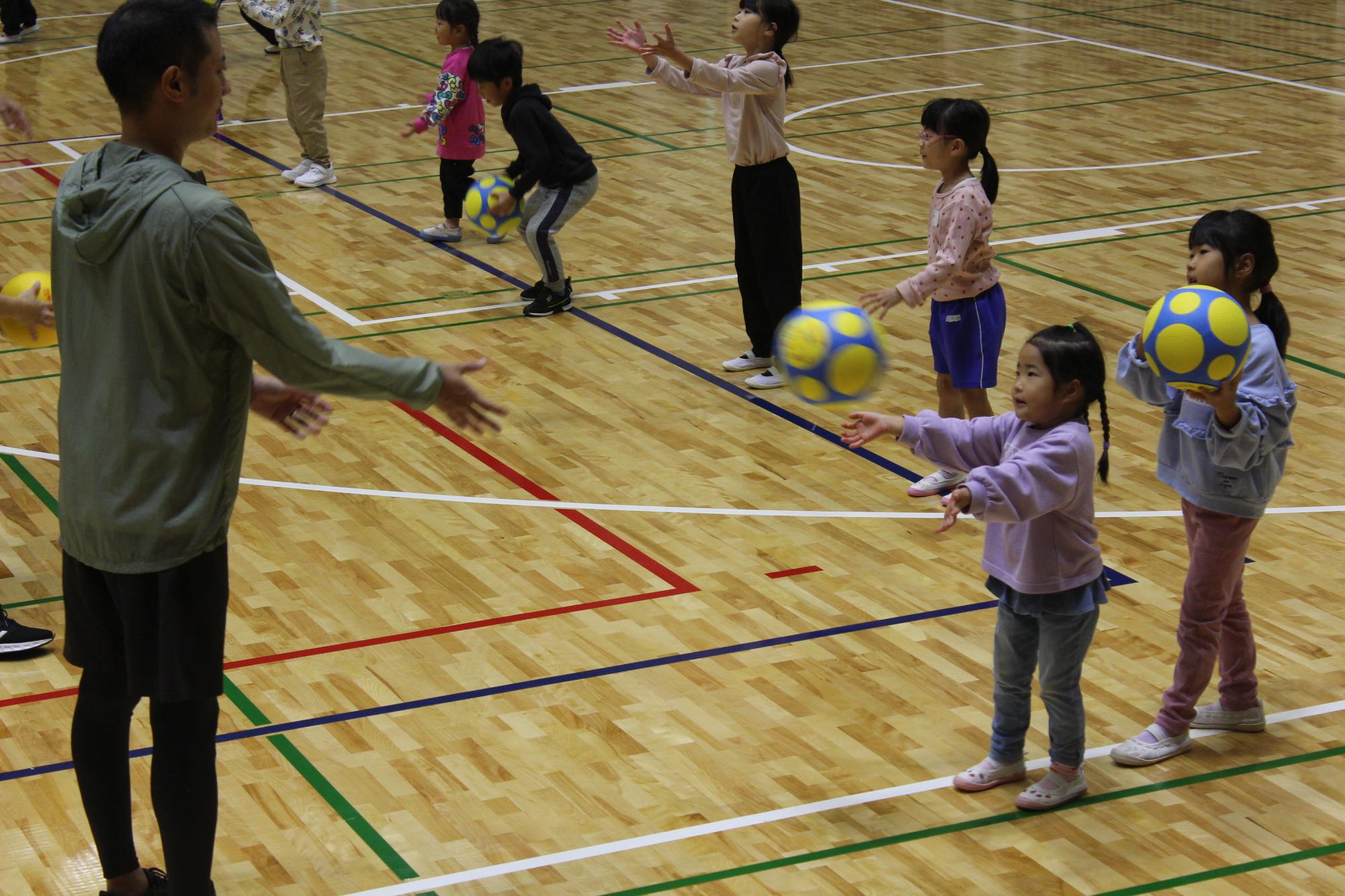 ラジオ体操で体を温めて、親子運動遊びからスタートしました。今回は、親子でボールを使った運動にチャレンジしました。投げる、捕る、転がす、蹴るといった動作は、全身の運動能力の向上につながり、また、相手との距離や方向を図りながら投げたり捕ったりすることで、距離間感覚や方向感覚が育ちます。