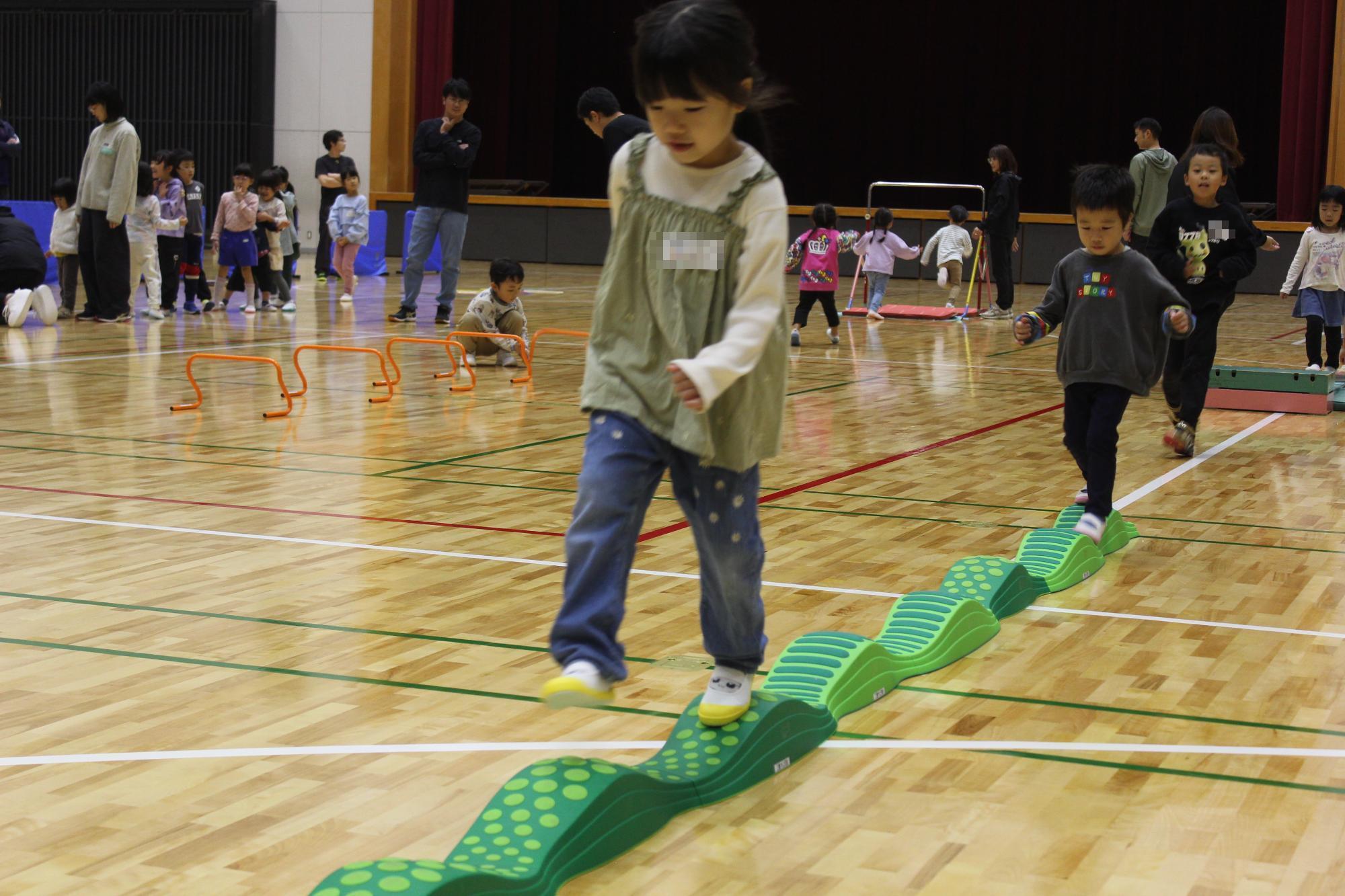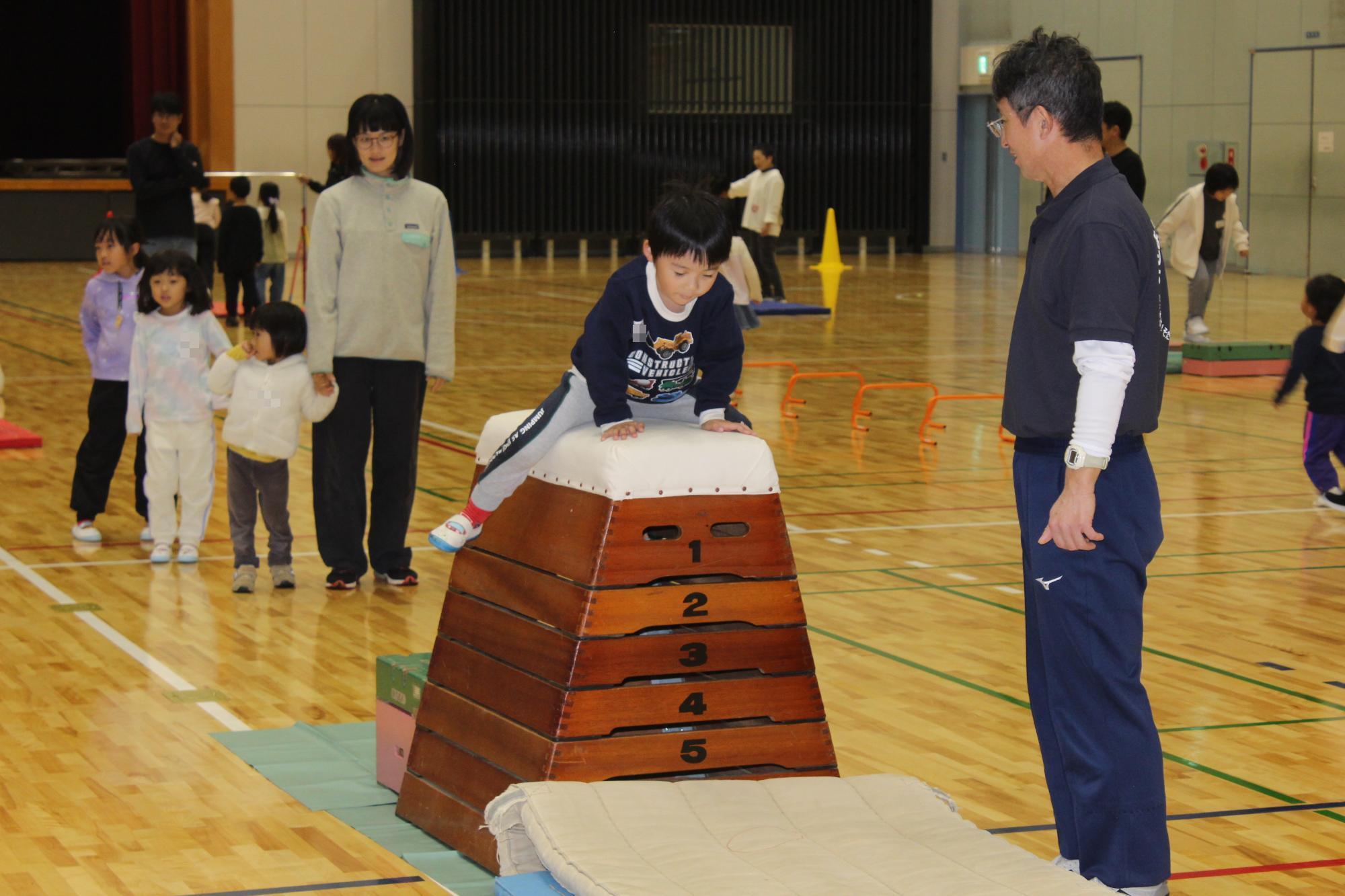 次は「サーキット遊び」です。全力疾走、トンネルくぐり、トランポリン、平均台、鉄棒、マット運動、跳び箱等を元気よく周回しました。途中、やや渋滞気味になったときもありましたが、どの子も前のお友達を追い抜くことなく、順番を守ってくれました。みんなで、けが無く、今回も楽しくサーキット遊びができました。