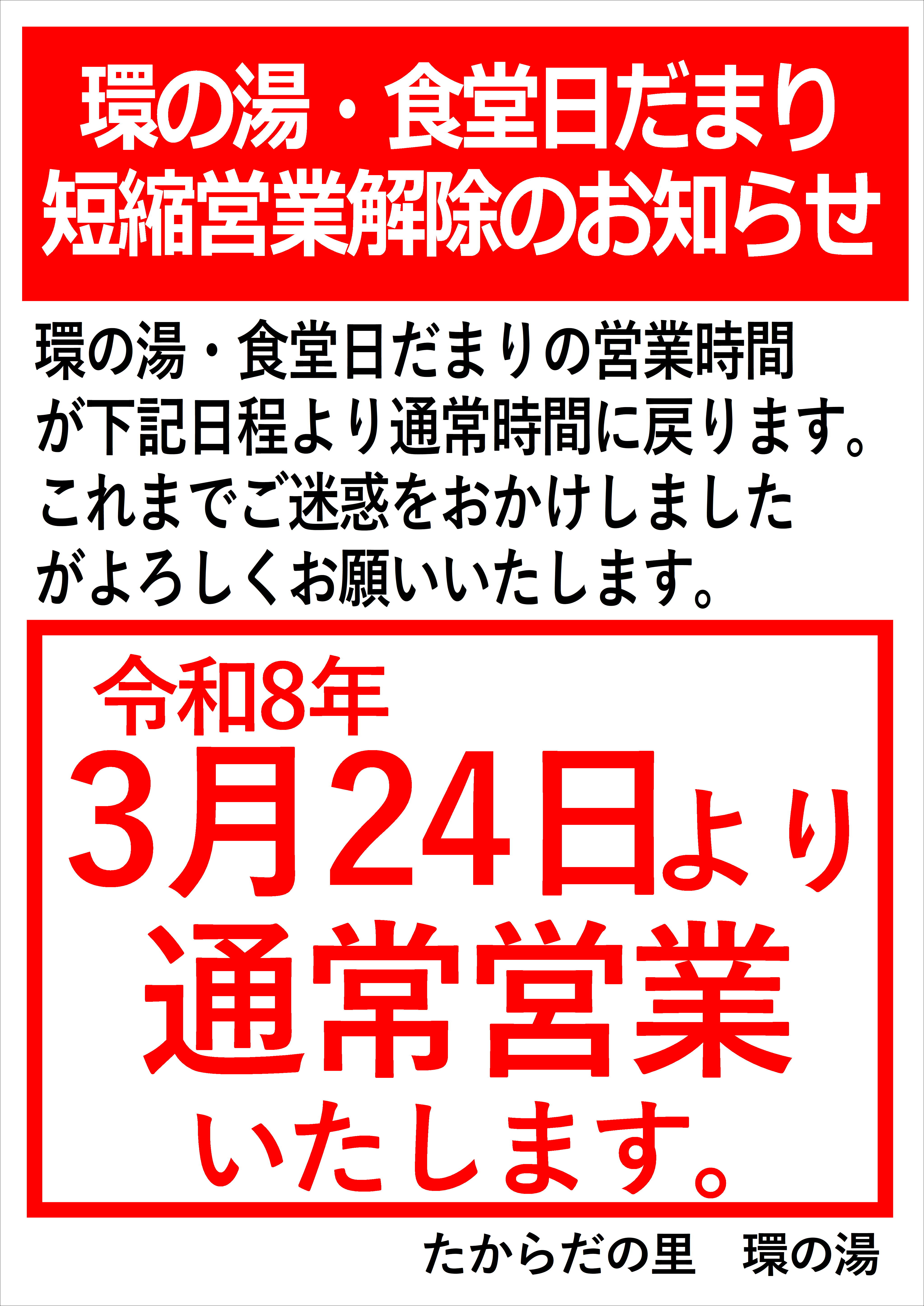 環の湯・食堂日だまり 通常営業再開のお知らせ