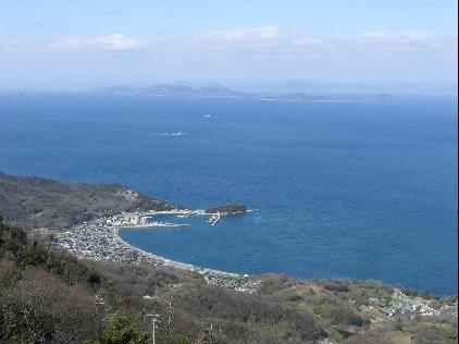 手前の湾に沿った集落は伊砂子・船越、山の向こうは詫間。