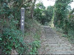 今は休校となっている粟島小学校の前を通り、山道をどんどん進んでいくと、1合目の指導標(?)が…。ここから、いったいどんな道が待ち受けているのだろう。気合を入れて出発!