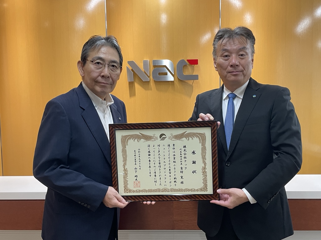 9月19 日、「2050三豊市カーボンニュートラルプロジェクト」に活用してほしいと、企業版ふるさと納税として寄附をいただいた株式会社ナックに感謝状を贈呈しました。
