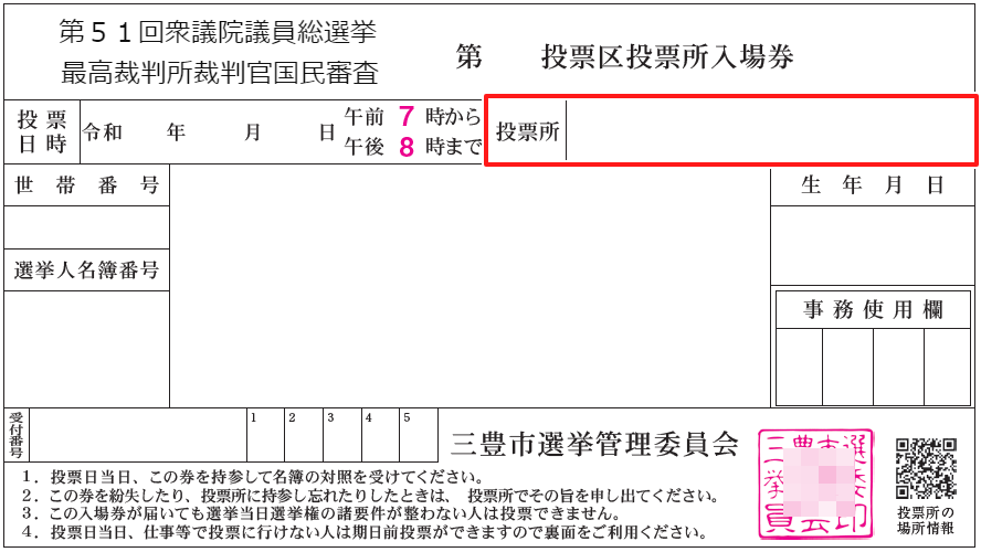 投票日当日は、投票所入場券に記載された投票所においてのみ投票できます。どの投票所で投票できるかは、郵送される投票所入場券でご確認ください。