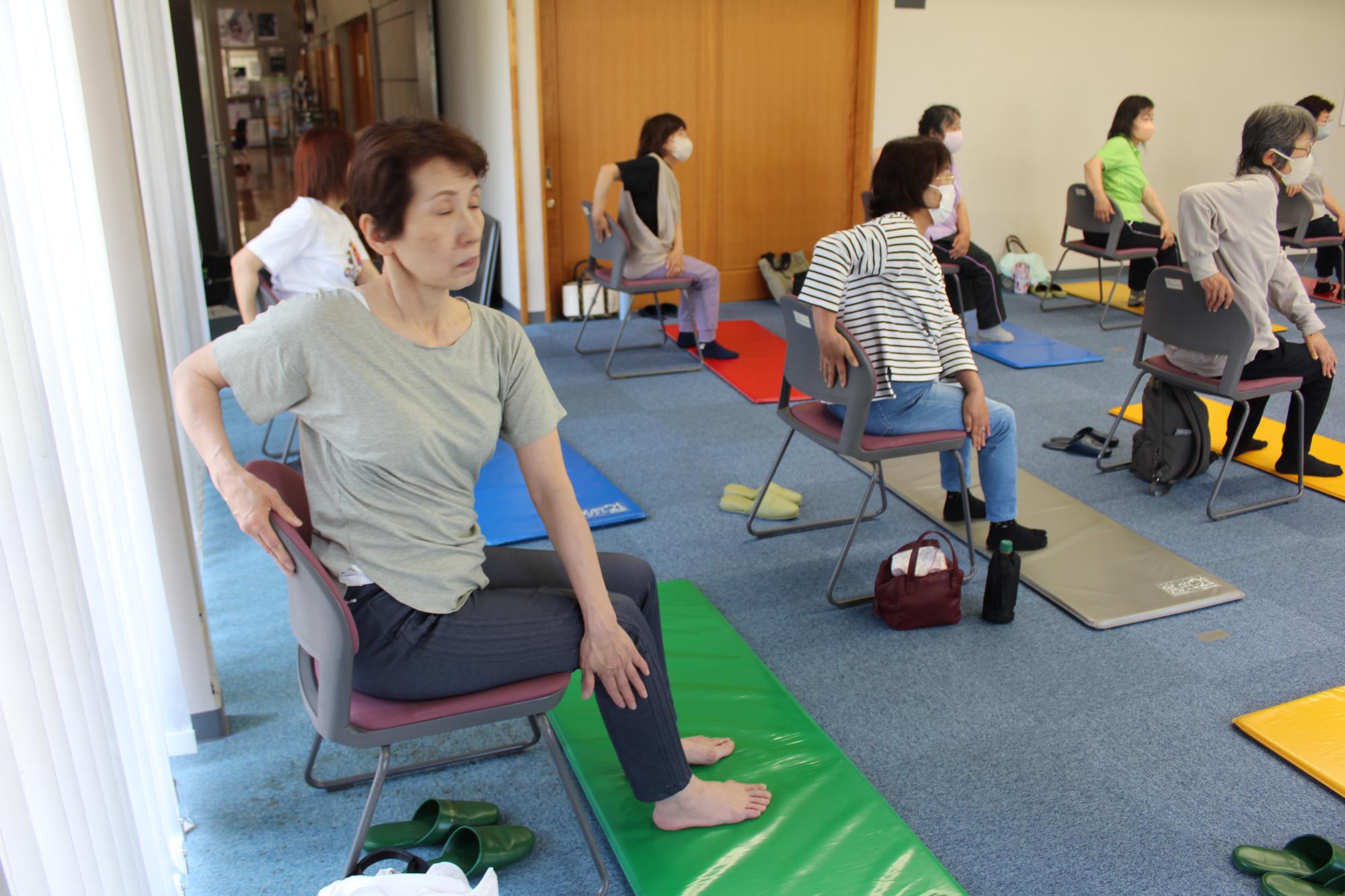 講座のタイトル通り、正しく美しいウォーキングを身に着け、膝痛を予防することを目的とした講座ですが、実際に歩く運動は行いません。椅子を使ったエクササイズとストレッチを繰り返すことで、身体全体がまんべんなく鍛えられます。